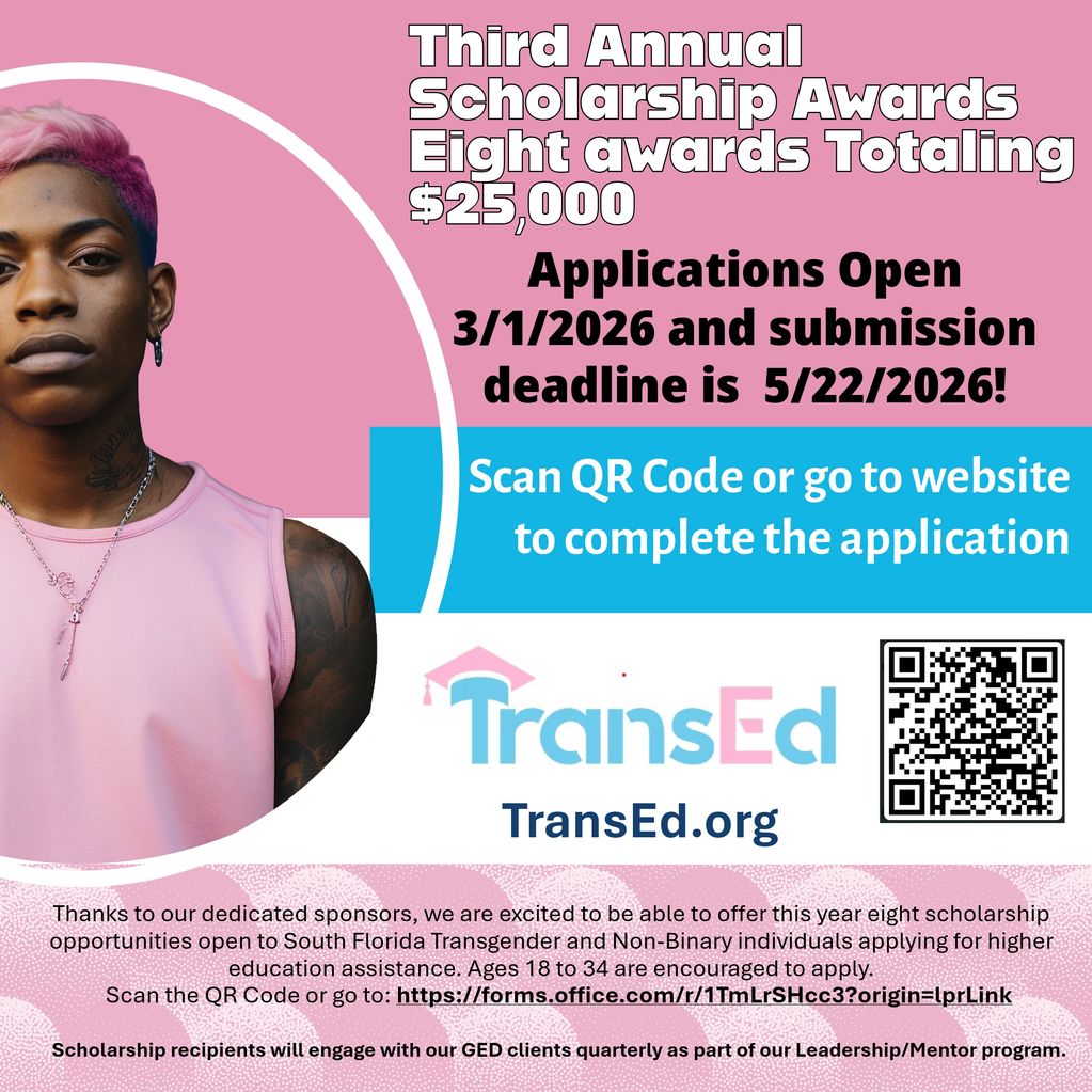 We offer an annual vocational/higher education scholarship award for transgender and non-binary individuals. Ages 18-34 are encouraged to apply.